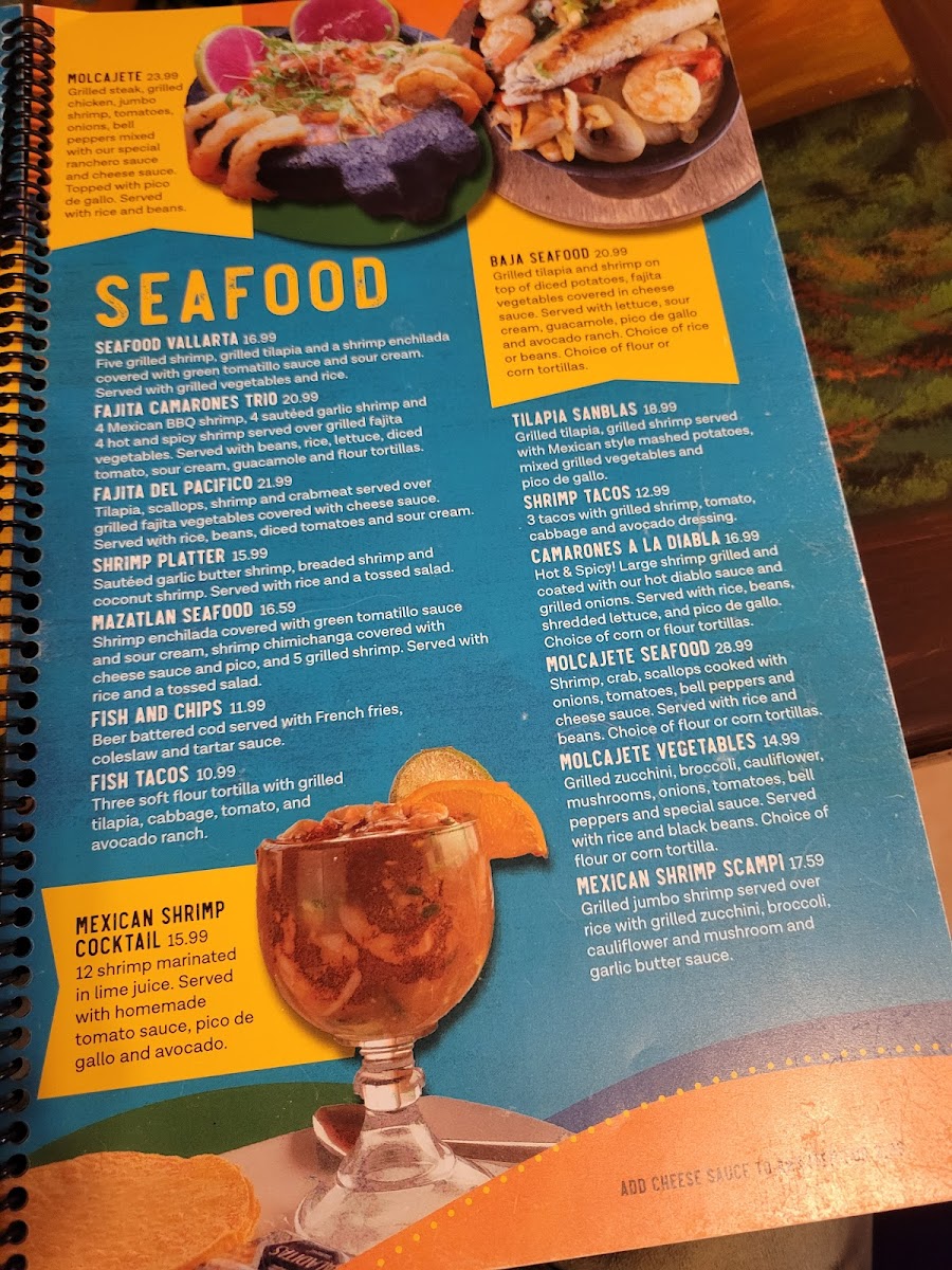 Shrimp, crab, scallops, cooked with onions, tomato and bell peppers. 10" flour tortilla, with cheese sauce on top. (to add extra shrimp go to A la Carte)